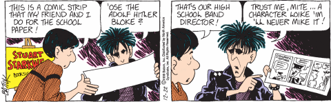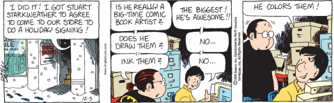 Self-deprecation requires you to honestly laugh at your own shortcomings. Tom Batiuk absolutely cannot do that. He carefully micromanages every detail of his public image, like North Korean propaganda. He seems afraid that revealing any actual imperfections will cost him award opportunities.
