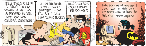 And, yeah, I do a few of the others on the list. On the other hand, unlike Batiuk, I’m not a professional writer. I don’t even know if anyone would consider me a “passable” writer, and I usually don’t write anything other than entries in comment sections. Certainly, I’m not being paid to write things seen in newspapers across the country, so I can cut myself a bit of slack there.