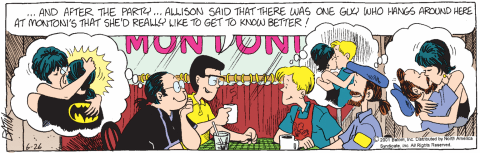 Picture the creative process. Me, I imagine Bats listening to NPR, hearing a feature on Dorothy Parker or the Algonquin Round Table, thinking it very sophisticated, and deciding to show off his erudition in his determinedly blue-coller, Pluggers-esque strip, whether it fits the characters or not.