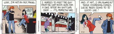 How long ago was their first date? I don’t know, even in Act II Funky time was funky. Becky is still in college I guess. Before their first date Wally had left for the military, and at this point he is MIA, presumed dead, in Afghanistan (for the first time.) So maybe it’s been a year or two. And much like Becky and John’s first date, they go to a cheap movie theatre. But this time it’s The Valentine. Ralph Meckler had an arc sometime before in Crankshaft where he’d decided to fix the old theatre up. The plot was recapped in a Sunday Strip when Hannah and Max were buying the place.