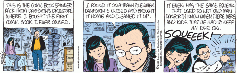 I’m trying to make sense of Jff’s comment that he brought the box home after his mother died. If memory serves, his mother lived with them for a good portion of the strip (she was there before Crankshaft moved in). There was an arc after she died (I think around the time the Starbuck Jones movie arc was playing itself out), where he goes back to the house he grew up in to retrieve something from under the floorboards of his old room, but I don’t think it was his comics.