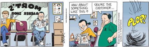Well, the Komix Korner craziness continues in Mar. 23’s actual “Crankshaft” installment. Having just discovered that his mom, at some indeterminate point in the past, gave his Spider-Man funnybooks the heave-no, J*ff immediately has to drive all the way to Westview to buy reprint collections of said books. Did it ever occur to him that he literally lives next door to a used bookstore? Did he stop to shop online with Glamazon, Fleabay, or whatever Batiuk is calling certain e-retailers? No, it’s the KK or nothing! Makes perfect sense.