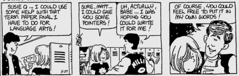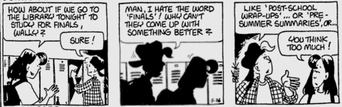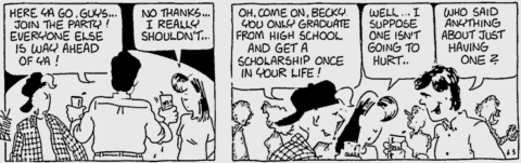 I think if any married couple in Westview ever tried to procreate on-panel in Act III, it would have been the funniest damn thing that ever happened in the strip. Imagine Mindy trying to read a sex manual in a honeymoon suite, while a traumatized Pete reads a comic book and sucks his thumb lying in the fetal position. Imagine Cindy trying to jump Mason, who wants nothing to do with it. Imagine the bedroom equivalent of Les and Lisa’s “interlocked braces” incident. There are so many awkward couples, the possibilities are endless.