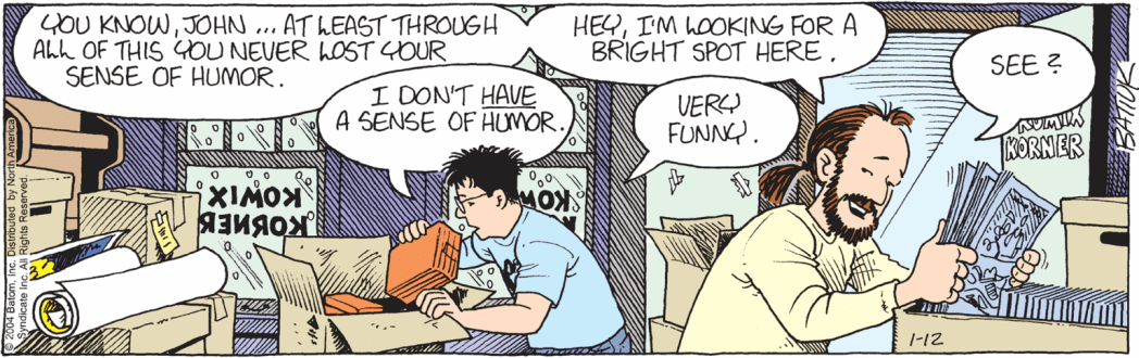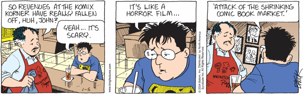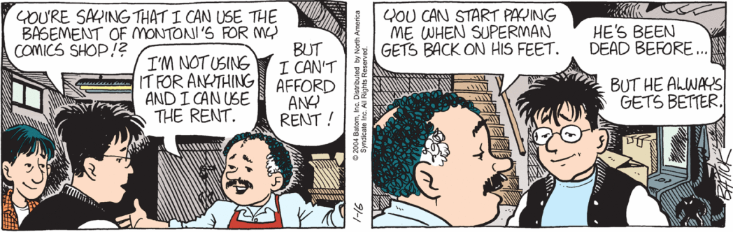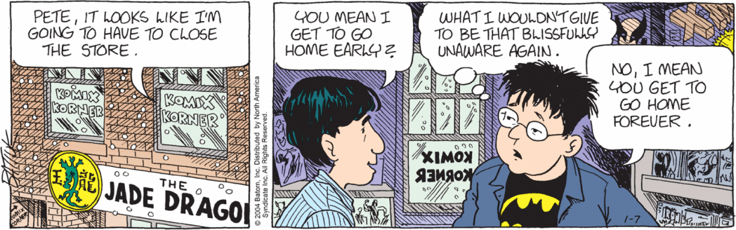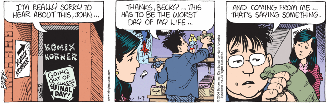 This is the best one yet, as I missed all of this when it originally ran. John’s store failing is such a classically Batiukian arc. Back when I first began commenting here, the regulars really hated Dead Skunk Head John, which mystified me a bit, as he wasn’t nearly as objectionable as Les or Ghost Lisa. Now I understand, though. Oh, the sad-sackery. Other than Les, he just refuses to let these characters succeed at anything. I mean, why couldn’t John have been a successful, fun comic book store owner, who made lots of hilarious comic book references? Why did he have to be an emotionally-stunted man-child and an abject failure? What happened to Tom that drove him to consistently torture and kick these characters around like that?