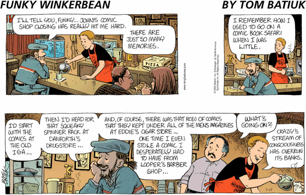 Long years ago, I somehow discovered the Comics Curmudgeon website. There, I learned that “Funky Winkerbean” was still being published, although vastly different from the mildly amusing high school strip I remembered. I also learned that the strip now made frequent references to comic books. As a long-time comic nerd, I was intrigued and surfed the web for more information.