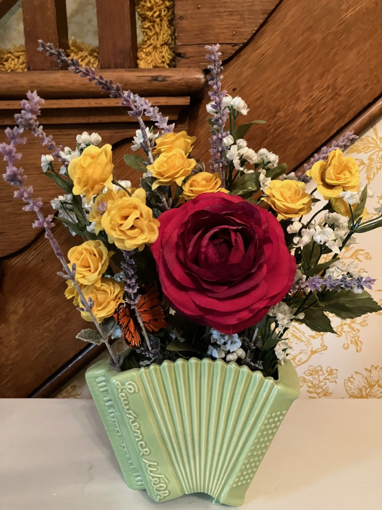 I do actually have a decent little horde of Lawrence Welk tchotchkes. Keychains, spoons, shot glasses, coffee mugs. That vase was a present I gave my grandma for one of her birthdays, 96th? 97th? I can’t remember. I put the arrangement together to fit inside. It was one of the things she took with her to the nursing home. Now it’s mine again, and when I see it I smile.