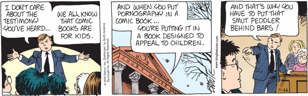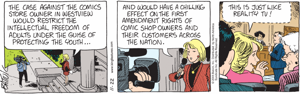 Neither Lisa nor Batiuk seems to know what this case is actually about. From the way Lisa’s bloviating, you’d think this was a challenge to John’s right to sell comics of any kind, or hell, for comix to exist in Westview. But that’s not what he was arrested for. He was arrested for selling porn in an environment unsuitable for selling porn according to local edicts.