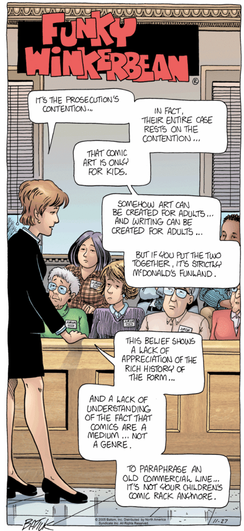 Sure, by the early 2000s comics are for grownups was a widely held belief even by normies, at least within comic-store mainstream north american direct market superhero comics. But did everyone believe that about comic strips that run in your newspaper? Apparently not! But since Funky Winkerbean was unlikely to run next to a strip of tentacle porn on the same page we have this contrived situation to bring his point home.