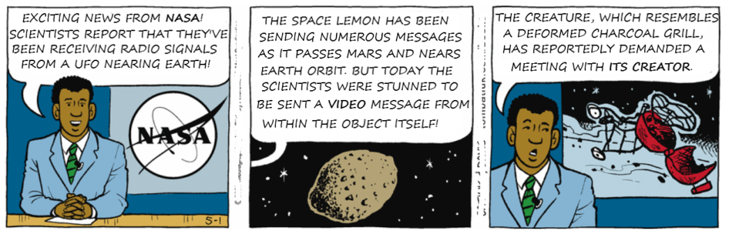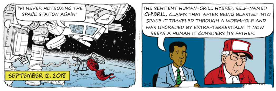 The asteroid is leaving the solar system, but also still going to collide with Earth? NASA can’t send up another craft to intercept it in time, even though they have ten thousand years to do so? (It sure didn’t take that long to send up the first craft.) And all this to set up the “Ed’s going to launch another grill into space to knock the asteroid off course”, the “joke” that most people expected all along.
