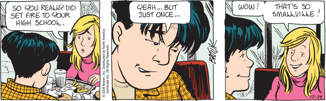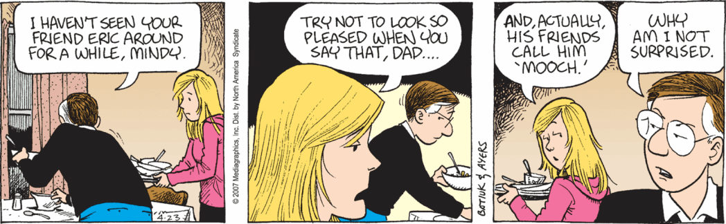 When you’re doing a gag-a-day strip, continuity and history doesn’t matter nearly as much, as time is standing still. The characters are all caricatures (say that five times fast), and that one defining trait is all the reader needs to know. “Hey, look, the jock bully and the hot girl are goofing on the hapless dweeb LOL”.