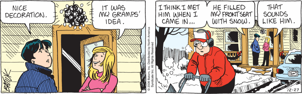 But if you’re doing a serialized strip, where characters develop, grow and change, of course continuity matters. If you do a series of stories about the jock bully’s tumultuous home life, or the hot girl’s insecurities, you can’t just go back and use their old defining trait as the basis of a gag anymore, as you changed all that when you fleshed the characters out. You can’t, to use a real example, have a character grappling over the ramifications of his father’s advancing Alzheimer’s, then have the father become a silly, quick-witted old horndog later.