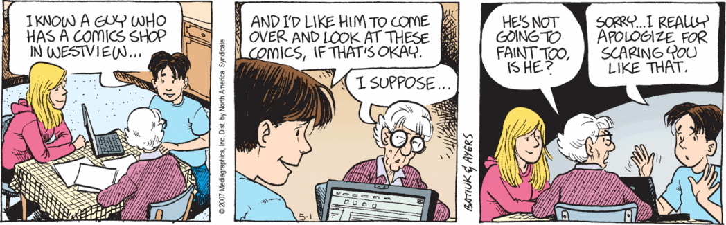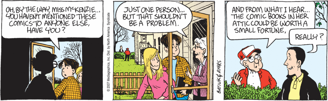So it’s strange, but not completely out of left field to put them in a mildly antagonistic role here. After all, they don’t know DCH John, and it’s not like they were going to steal Lillian’s comics. We don’t even know if they’re planning to try to lowball the little old lady. Just that they see an interesting investment opportunity.