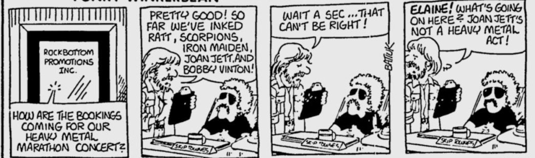 So the joke *was* “Joan Jett is so not heavy metal she gets called out even when an early 1960s teen crooner is an option.” Okay, but why Joan Jett? I don’t she even claimed to be heavy metal. In 1985 she was closer to punk rock. This joke would have worked better later, when heavy metal had sub-genres, and you could have called out Bon Jovi and Skid Row for not being heavy metal.