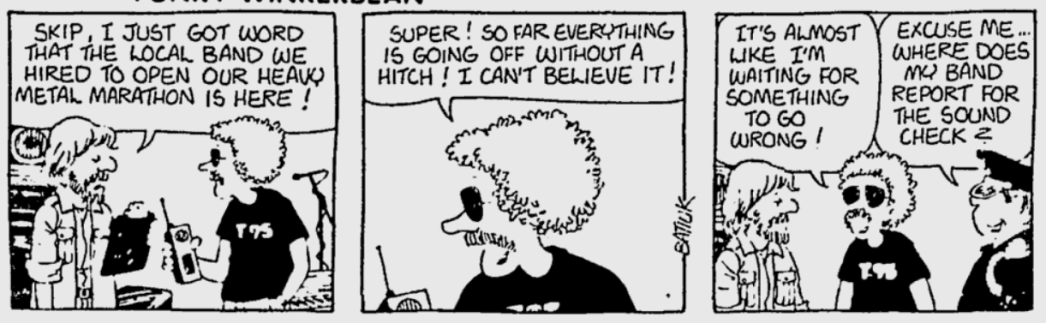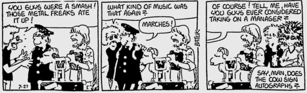 The marching band in the heavy metal concert can’t help but remind me of Opus’ audition for Deathtongue with his tuba. “Heavy metal?” “Weighty brass. Gimme a break.” (I probably shouldn’t remind myself of longtime favorites when reading this comic, though.)