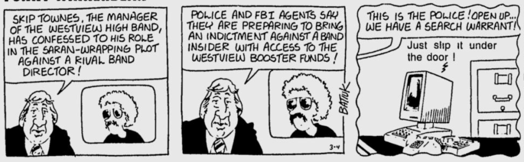 It’s not clear whether this guy’s name is supposed to be realistic, or if it’s just another aimless pun. Batiuk is never clear about what the jokes are and what we’re supposed to take seriously.