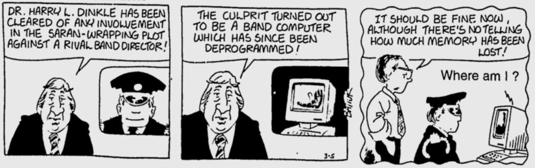 Back to the strip: That Act I arc is fun. Roadies? You mean band moms! That’s a decent line! The story is lighthearted, has a defined start and finish, and Dinkle is still just a wacky band director as opposed to overbearing Lord of all things music. I missed a lot of Act II the first time around, but I appreciate the revisits that show just how weird and dark it all got.