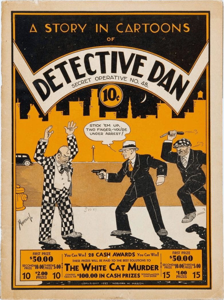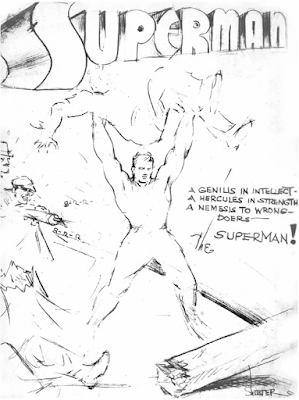 Later, after reading some Detective Dan comics, they tried out a hero character named The Superman. This hero wasn’t an alien and got his powers through science. They wrote and drew an entire comic book and shopped it to the publishers of Detective Dan, but the book wasn’t published. Joe Schuster burned almost the entire book, save the cover, and a early sketch for a different cover.