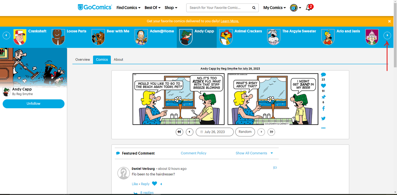The main benefit of the “Comics I Follow” feature is to make it easier to read the GoComics you enjoy/hate read. In the example below, my personal “Comics I Follow” are listed in the horizontal blue band. Clicking on the white arrow on the right navigates to the next “Comic I Follow”. The white arrow on the left navigates in the opposite direction. Clicking on the comic name itself in the blue band also takes you directly to the comic’s “Comic” page. Only the comics updated today are listed. It’s a lot nicer than reading your comics one-by-one from the big A-Z list.