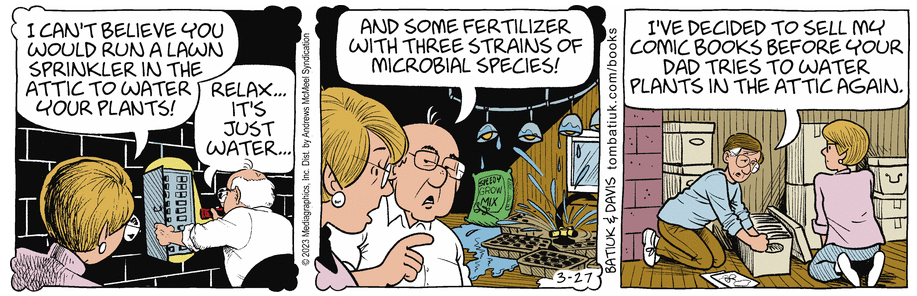 Okay, now read that paragraph again, but replace “comic books” with “drugs.” This is what Tom Batiuk sounds like. He sounds like the kind of braindead stoner you meet in college. Who can’t function without weed, can’t go to class because he needs to buy weed, and can’t even have a conversation about anything other than weed.