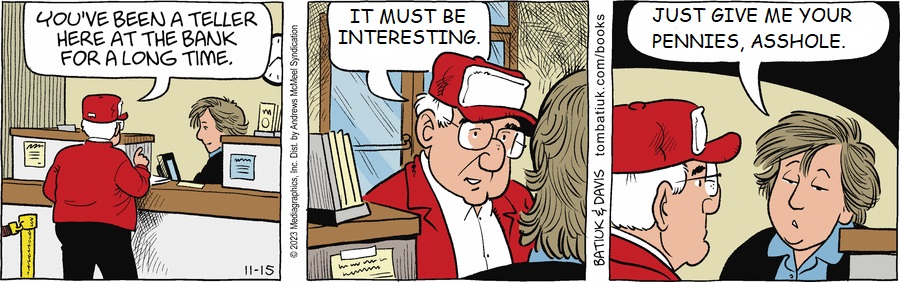 6. Just a thought: let’s say that one day, completely out of nowhere, Batty replaced every existing Cranky Funkerbean character with brand new ones. How long would it take everyone to say “hey, wait a minute here?”. Because for at least a few days, and maybe even weeks, you’d read it thinking it’d all make sense eventually, like it was just an introduction to a new character who’d soon be interacting with the regular ones. So you’d just keep reading it for a while, waiting. It’d make for an interesting experiment.