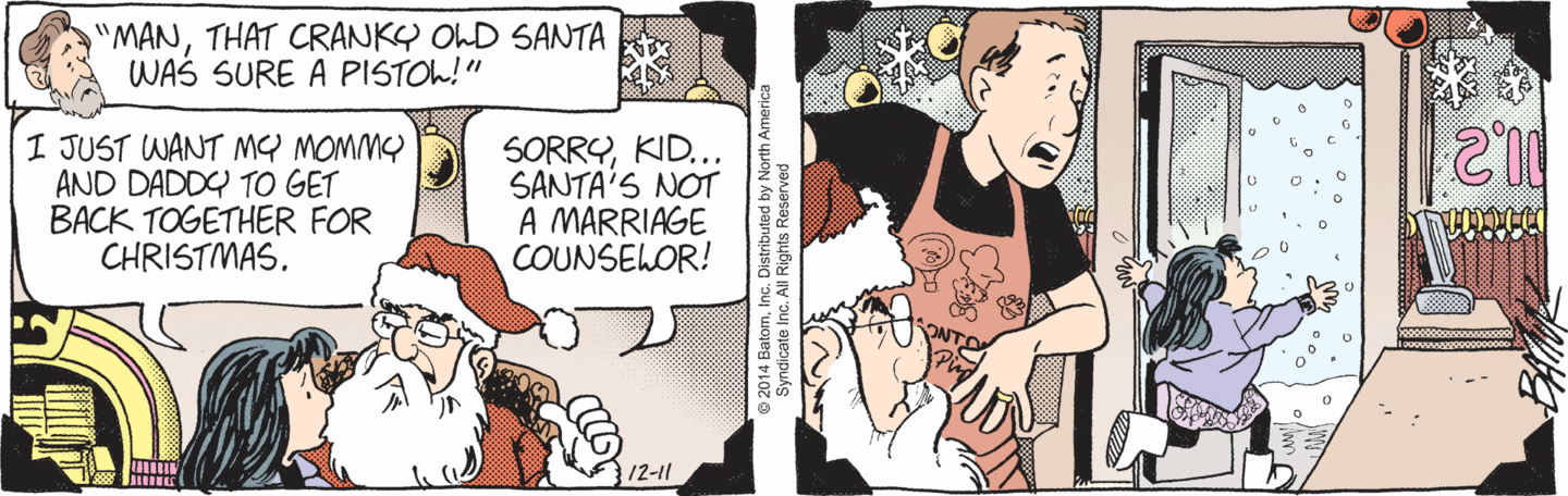 But from the inside, from within the Funkyverse. Knowing what I know about these characters, it’s creepy. It’s like the snow falling from the sky has amnesia water in it. Did they all forget about Pete being Funky’s former renter, Mindy being a former waitress, Cranky being a former Santa, and all three of them having been shown eating at Montoni’s multiple times?