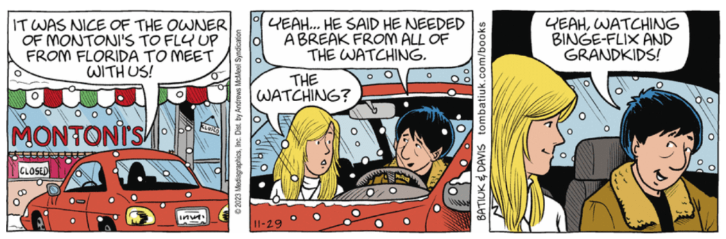 I just learned (via my daily update from the New York Times, which once allowed Batiuk to hold forth about how great his “killing Bull Bushka” arc was going to be) that “transfer portal” (referenced in “Crankshaft,” 11/25) is apparently an actual College Football Thing rather than a bad attempt at a sci-fi reference.
