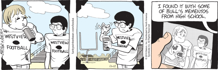 This strip is from 2019, but it was the key plot point in Bull Bushka’s CTE arc later six months later (almost to the day). The later story never once said that Bull killed himself because he didn’t receive disability benefits. Even the big reveal concealed it: