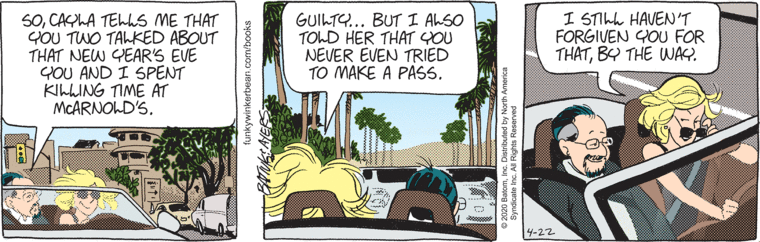 The first one is the most obvious. Funky Winkerbean has invested weeks into the arguments behind comic book covers; the backstories of comic book makers; the Starbuck Jones movie; storylines that re promptly dropped; and so on. Of course, they’re there because these are Tom Batiuk’s favorite things to talk about. My rant about Pseudoexposition lists other examples.