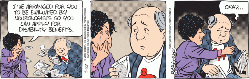 I would have to respectfully disagree about the NFL disability letter, because the first panel specifically says the letter is regarding Bull’s application for the supplemental disability plan. With that information already in the strip, “We regret to inform you” pretty well covers what the letter says; honestly, adding the extra exposition to the second panel would have been redundant and overly wordy. (Not that that ever stopped Batiuk at any other time, of course.) Even without knowing the strip from six months earlier, it’s still obvious what the letter is saying, I think.