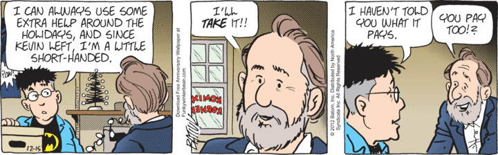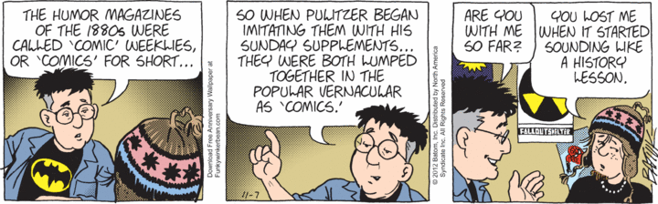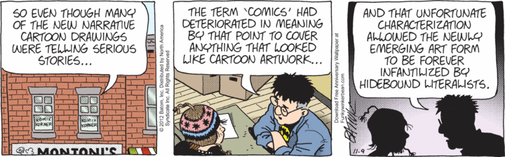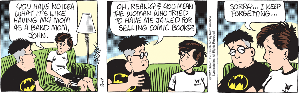 The thing that always struck me about the “comics don’t need to be funny” story is that Batiuk still felt it necessary to include an ostensible punchline in most of those strips. “Comics don’t need to be funny, but I’m gonna write bad jokes anyway!” Way to undermine your argument there, Tom. (But then, he’s good at that.)