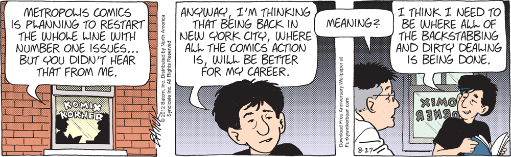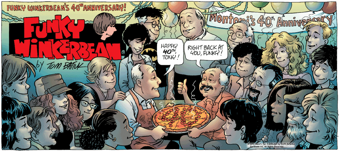 I’d never seen that 40th anniversary strip. It’s very appropriate: It ties in with a 40th in the Funkyverse and it shows a happy gathering of familiar characters, celebrating. It’s well drawn, well colored, not wordy, not irrelevant, and just generally well executed.