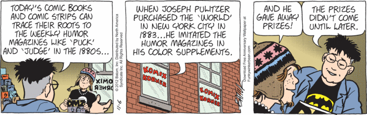 In November, we get another weeklong arc where ol’ Skunk-For-Head gets to serve as a fictional meat-puppet to pontificate on Batiuk’s myopic views on comic history. Part two of the Chullo and Skunko The More You Know Show.