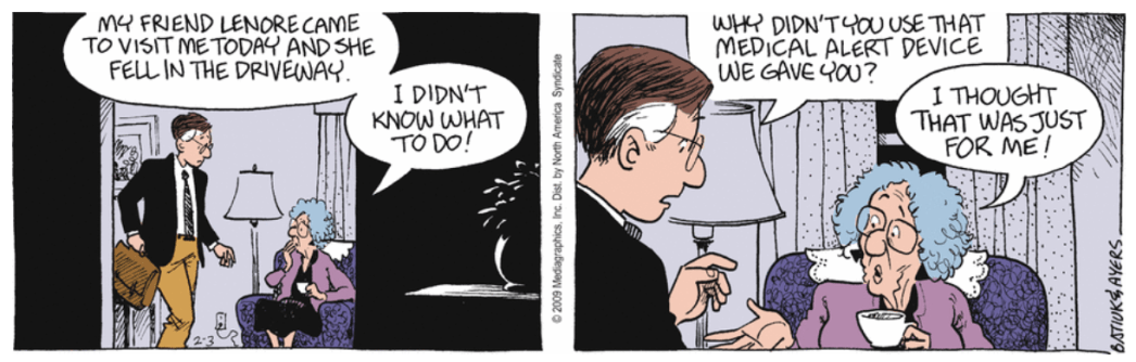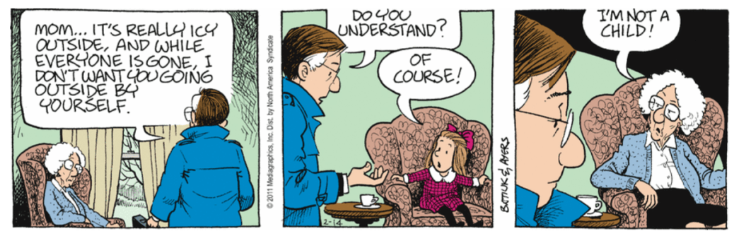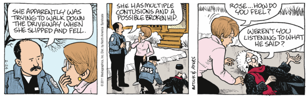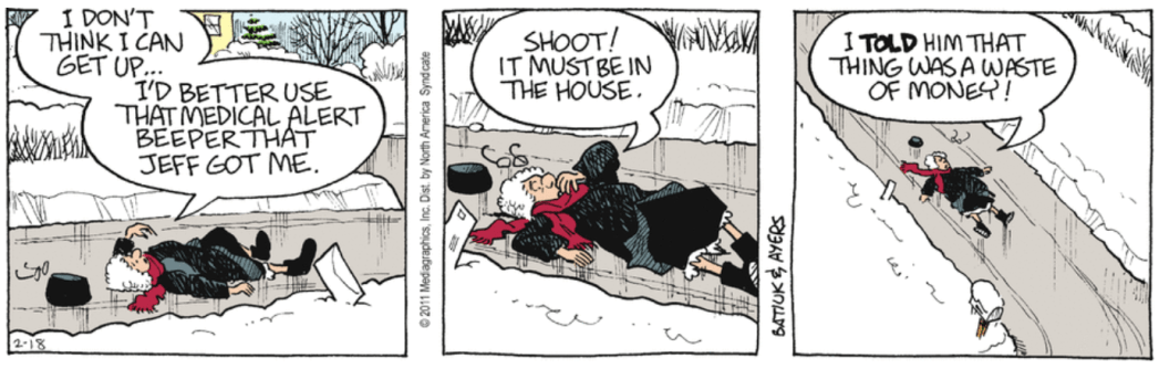 Regarding today’s Crankshaft… others have already mentioned that falls in the elderly just aren’t funny. You’d think a man in his late 70s would know that. I personally was close to two people, one in his 80s, one in her 90s, who were healthy and active and fully mentally present until they had falls. Both suffered a terrible decline, physically and mentally, ending with their death. “T’aint funny, McGee.”