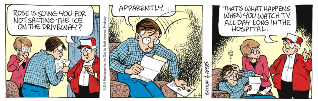 We used to get hilarious strips of old people slipping and falling on the ice more often, when Rose Murdoch was still alive. For example, back in 2008, when Rose was still living alone in a house based on Batiuk’s childhood home.