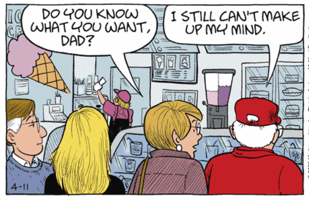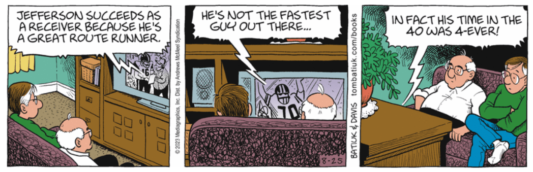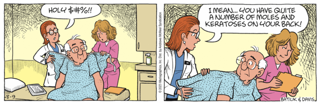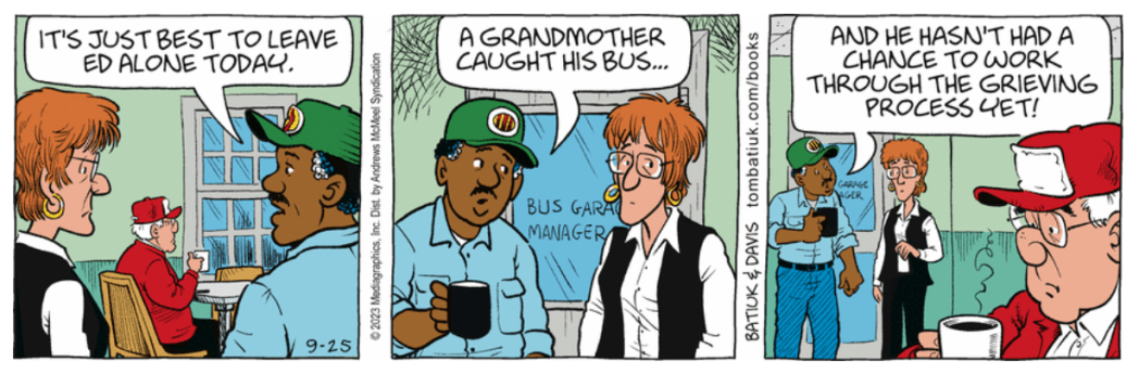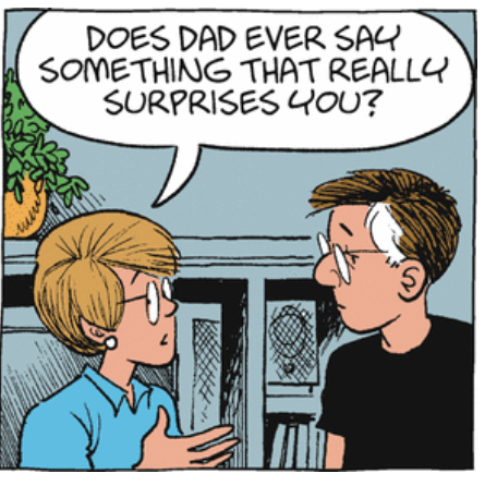 And if somebody’s 105-year-old grandfather showed up at a business sale to protect his 40-ish granddaughter from being “ripped off”, any self-respecting seller would immediately add 5% to the price and tell grandpa to show his Power of Attorney or fuck off. That’s insulting to everyone involved. (Especially Mindy, not that Batiuk cares or even notices.) But self-respect isn’t a feature of the Funkyverse. So they ignore his asshole behavior and act like it’s charming.