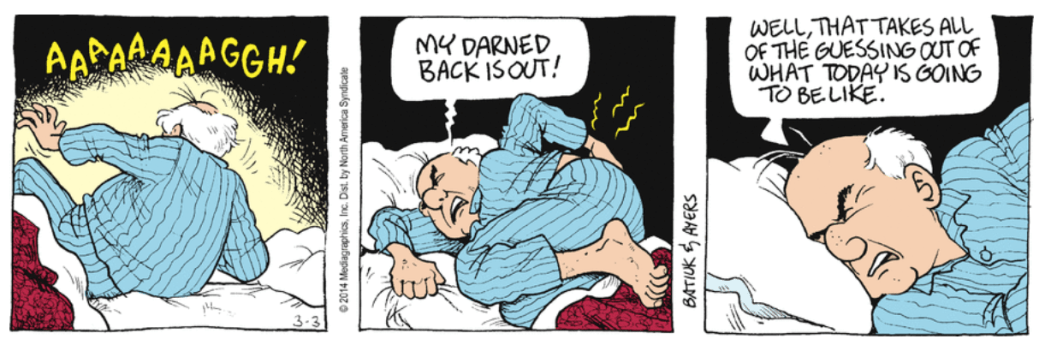 Original? Well, Cranky is no stranger to a massage. Back in 2014, when he threw out his back, his resistance to a massage served as the concluding conflict of the plot. And by the end…things started to look pretty…familiar.