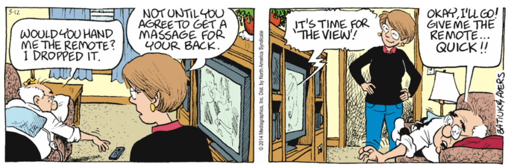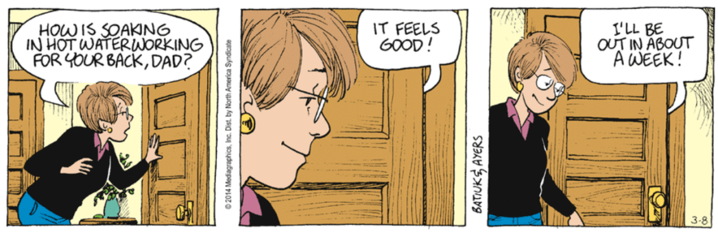 Recycling massage jokes is certainly quaint, but incredibly funny to come back here to see just how recycled the art itself is from the last time it was done. As acceptable as this is in comics, I can only imagine if Ayers has some strong thoughts checking in on what Batiuk is still writing.