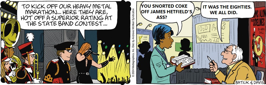 Well, I was just over on GoComics and saw the Sunday, 2/4/24 ‘Shaft strip, which features Ed dropping a prescription pill onto the floor which then rolls behind the fridge, prompting a comment about the large number of pills now residing back there. Something about this “joke” triggered one of my dormant brain cells (the ones that should have been used for remembering a foreign language or studying Sicilian geography), and upon checking out GC’s calendar feature I found almost the exact same routine in the strip from Sunday, 2/4/18. Does this mean that Batiuk will try it again the next time 2/4 falls on Sunday, in 2029? Only time will tell.