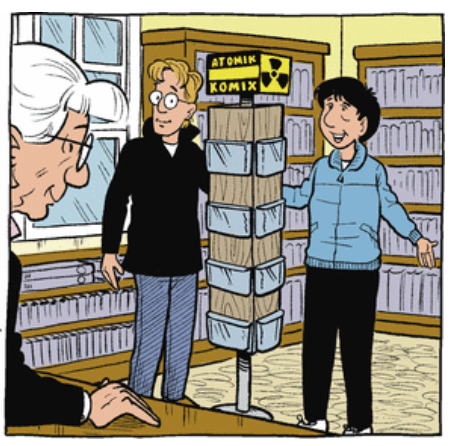 (suddenly a guy busts down the door of the Komix Korner, and uses his eye-beams to cut down everyone in it)