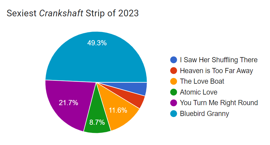 I supported the vote for full-frontal Crankshaft, but compliments to the winner, certainly something to the youngster shooting down the flirting. No wonder he goes back to making her miss the bus off panel (sometimes)