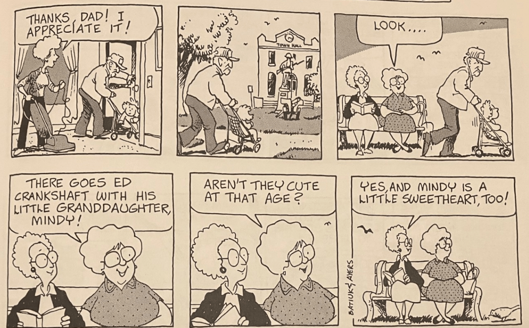 Every time I see an old Crankshaft strip I always wish that they had kept that specific character design. I don’t know why, but there’s just something about the Roman nosed, dot eyed, oblong headed design that seems like it’d make the garbage Cranky spits out just a little bit funnier imo.