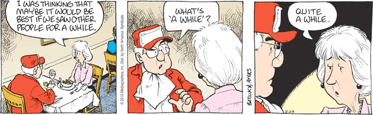 Then again this format was somewhat used to cut between dramatic moments in Jeff’s mom’s death and his dealing with the aftermath, so Batiuk might just think this is a clever narrative format.