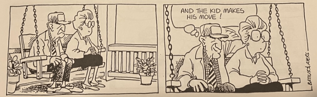 Well, that’s one way to save research and writing time. Just have your friends do all your research and writing for you! Especially when they have insight into a hyper-rare experience like playing for a high school sports team! What was Batiuk supposed to do, bring his sketchbook to a high school every day? Oh wait, he said in last his blog post that regularly did do that.
