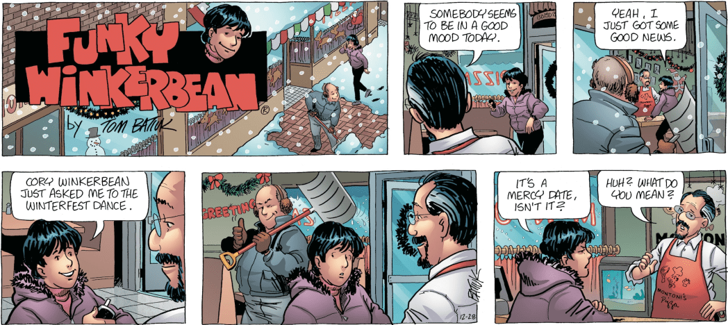 Speaking of books (is that a slick transition or what?), at that same “comic shop” on my website, along with Crankshaft coffee mugs and grilling aprons, [Also on my Amazon wish list!] you’ll also find copies of the brand new Volume 13 of The Complete Funky Winkerbean. This latest installment of The Complete Funky Winkerbean presents the comic strips from 2008-2010 and ushers the original Funky characters into middle age. In true Funky fashion, the characters have to grapple with very serious issues like nearly fatal car crashes, a war abroad, and a tanking economy at home. [IN TRUE FUNKY FASHION] These years are also where I first introduced Cayla which was a bit of a turning point for me as it allowed me to take the strip on a “time-jump” arc which gave me a lot of freedom to explore some different topics and ideas. [wat?] Here’s a teaser strip from December 28, 2008 (and if you want to go back and look, the strip at the top of this newsletter is from the previous week — December 21, 2008).