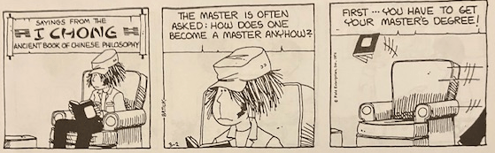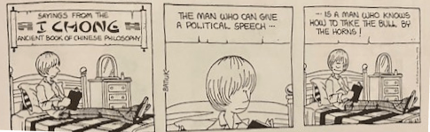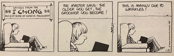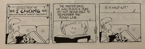 I actually happen to own a paperback collection of “Ching Chow” strips. They’re nothing like the ancient “Confucius say: [corny pun or Dad joke]” trope that TB reworked for FW. They are generally little tidbits of wisdom or maxims.