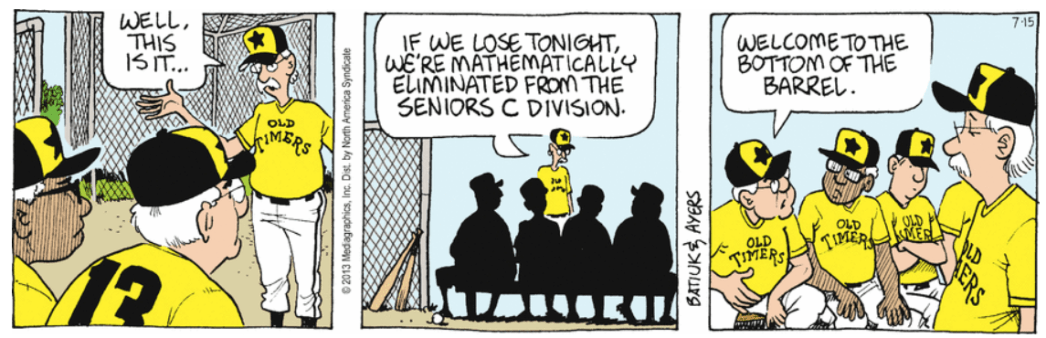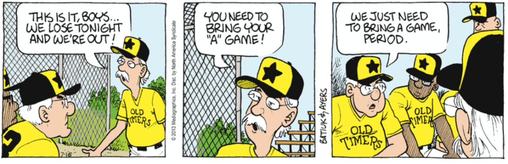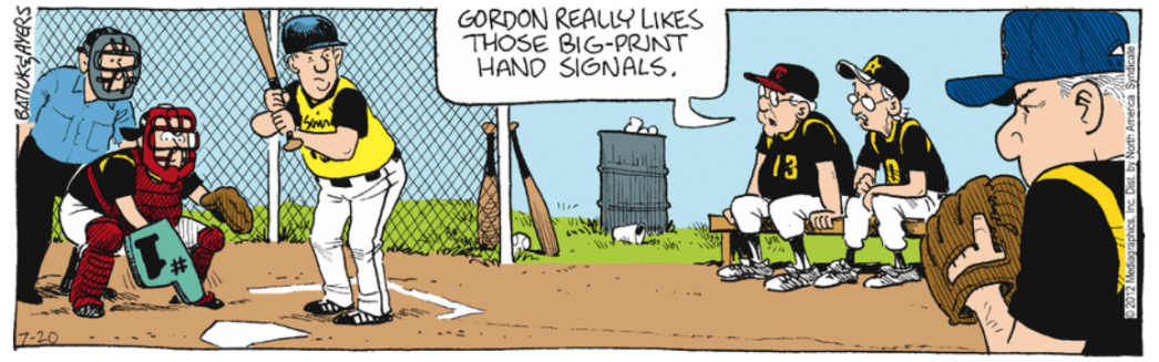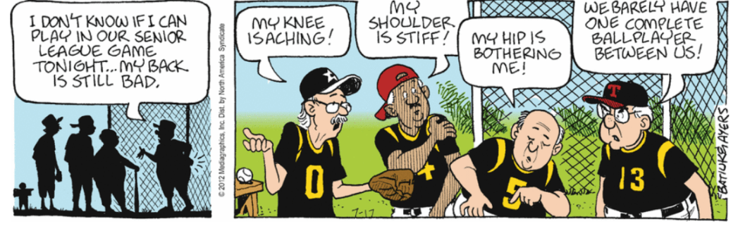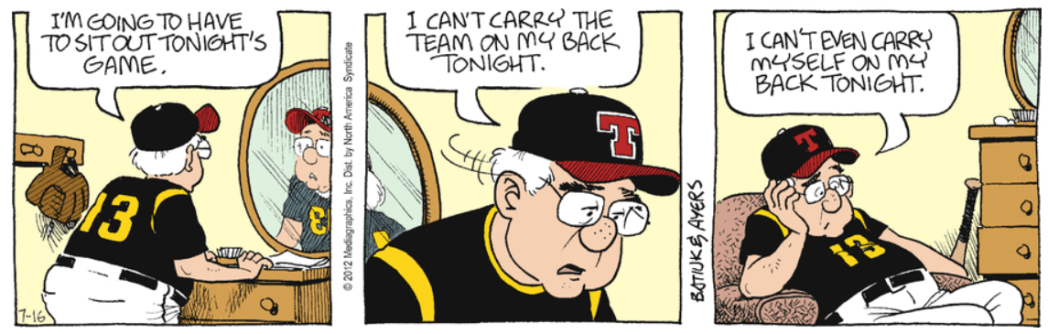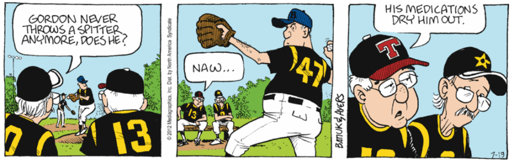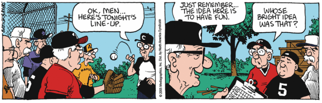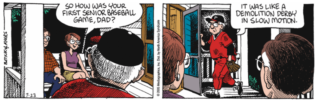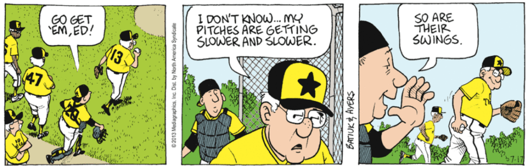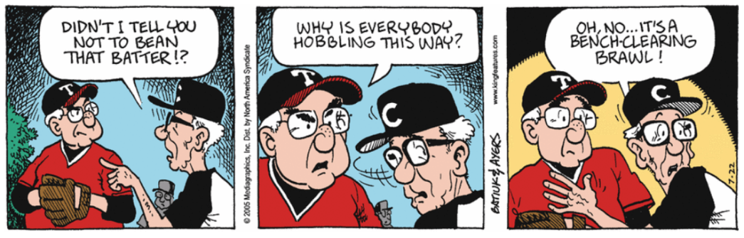 We here in the Funkyverse commentary community are currently gritting our teeth through the second week of ‘Senior Baseball’ hijinks in the copy-pasta nightmarescape that is Crankshaft. The art has been awful, and the gags as limp as a hand-me-down training bra. On the upside, at least this arc involves Crankshaft himself, and I would even venture that today’s strip comes closer to an acceptable joke then we’ve been used to so far this year. It’s inoffensive, and I have a sneaking suspicion it might make the shortlist for best of 2024. Though this says more about the dire state of comedy in 2024, than the quality of the strip itself.