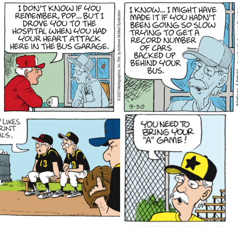 Either way, some livelier things to talk about than the rate of today’s Crankshaft, which is almost to the point of just repeating scenes from earlier in the week with the first panel alone. And the Batiuk blog is a bit bland too; the newest Match to Flame is a single reposted paragraph just talking candidly about how Les’s book publishing journey is an out-and-out novelization of Batiuk’s process with the IRL book, down to the joke about KSU looking past his old grades.