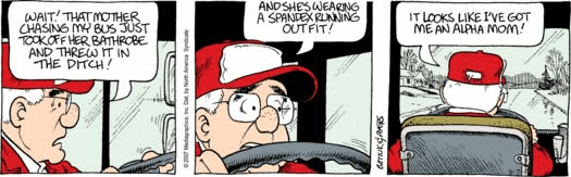 Much better example, Banana. It would have been funny for the strip to be silent, and to see a mother rip off her bathrobe to reveal a spandex running outfit, along with Crankshaft’s look of horror. Then maybe even a silent panel of Cranky flooring the accelerator.