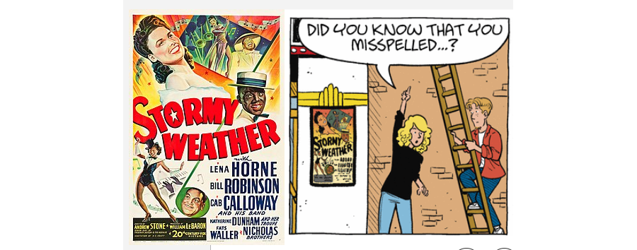 The last two days have featured Max putting up a marquee for a movie called Stormy Weather. I thought this would be another Phantom Empire, a 1935 western serial that Tom Batiuk adores and frequently name-drops in his comic strips. So I looked up what this movie is. It’s a 1943 musical with an African-American cast, including the biggest black stars of its day: Cab Calloway (seen by modern audiences in The Blues Brothers), Lena Horne (seen by much smaller modern audiences in The Wiz), jazz pianist Fats Waller, and dancer/singer/actor Bill “Bojangles” Robinson. The movie is a fictionalized biography of Robinson.