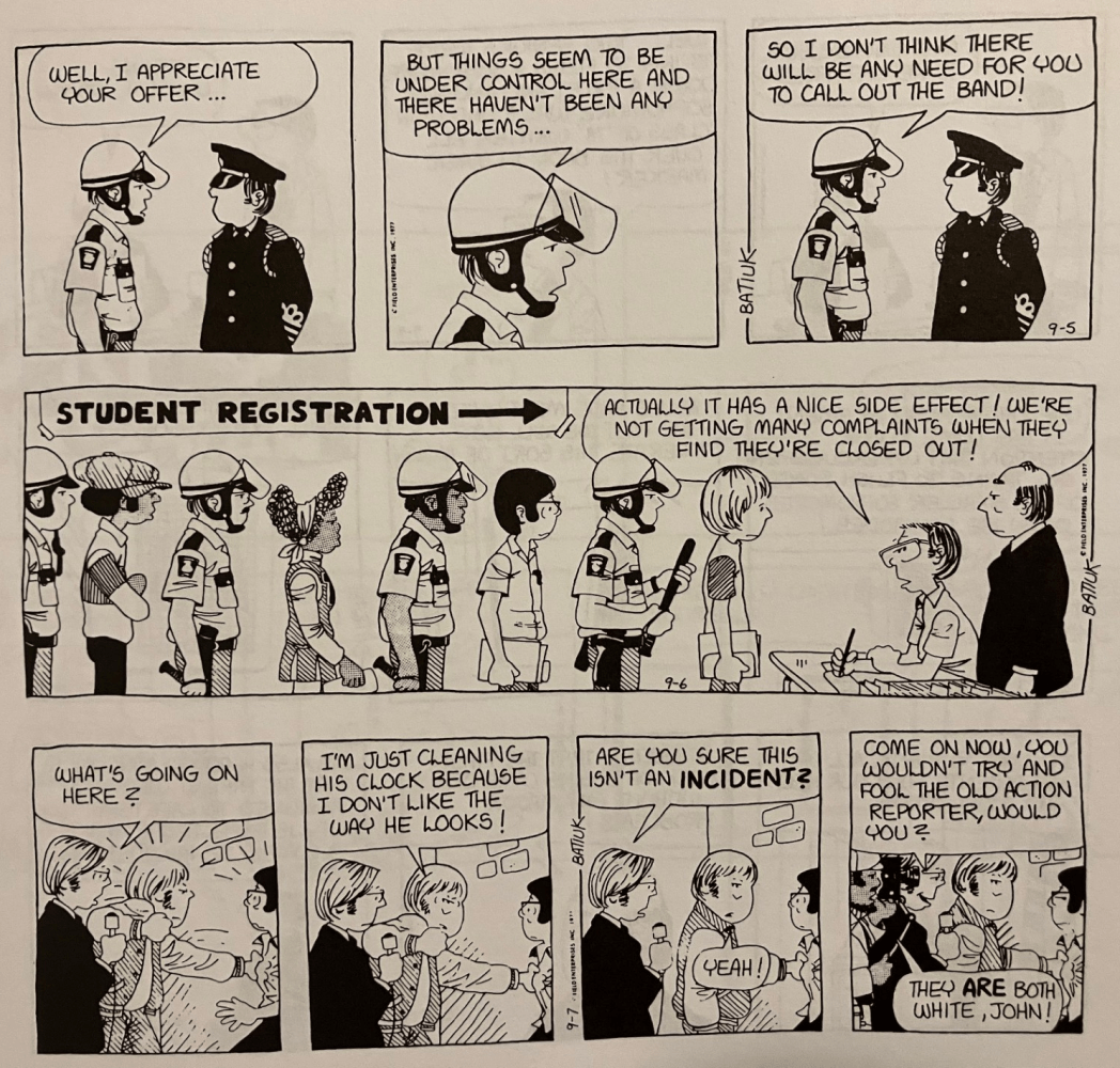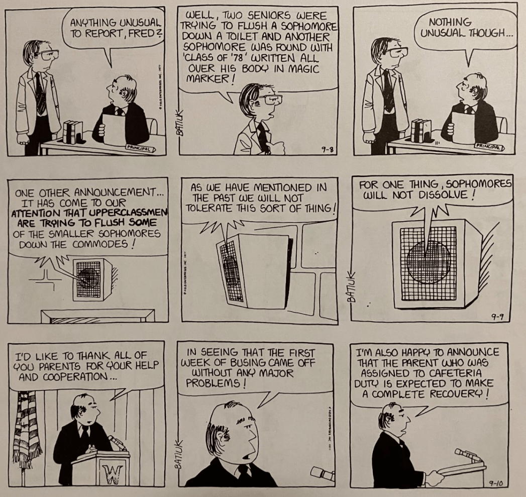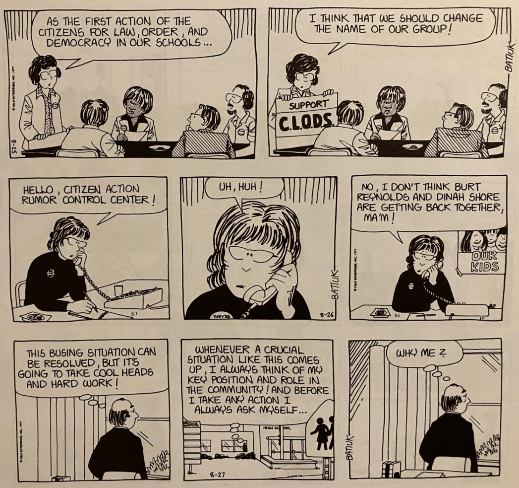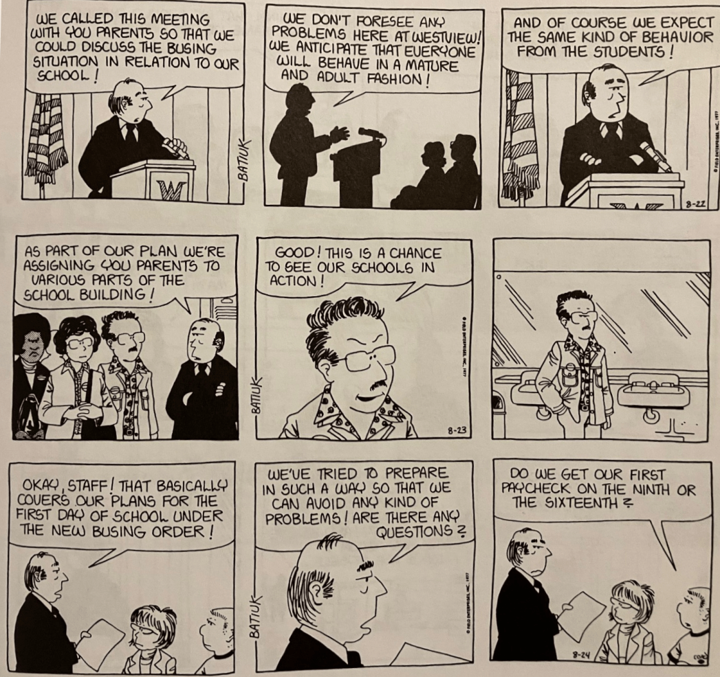 Batiuk doesn’t make his opinions on busing as a concept known in his arc. Maybe if you squint he’s mildly in favor. He’s deliberate in drawing plenty of black extras in every situation, to show an integrated society, but that’s it. Some might criticize him for being a fence sitter. But I think he made the right choice to make his stand on the issue not for, or against, but elsewhere. Poking some sardonic fun at the controversy, and also putting a strong emphasis on the stress on students and teachers when schools become political circuses.